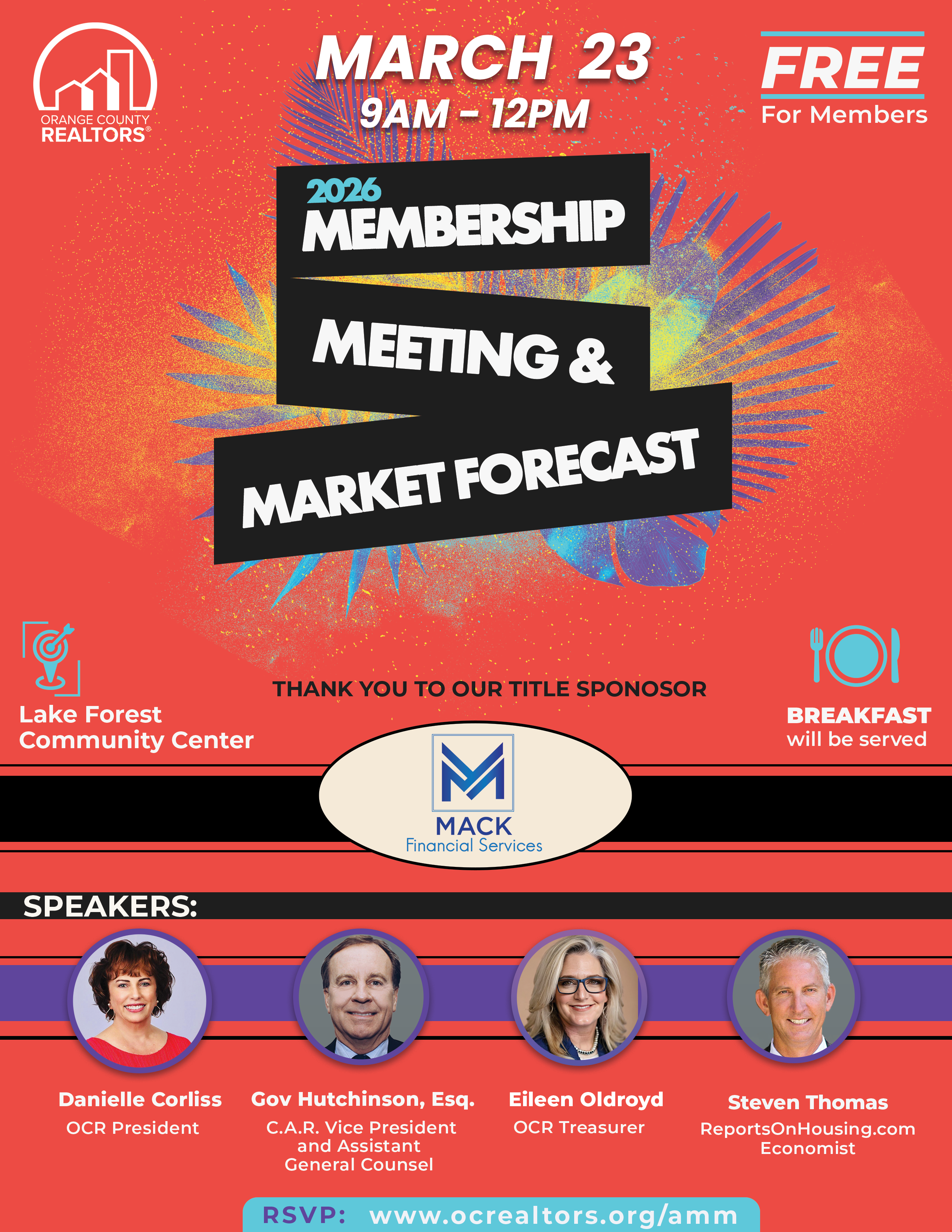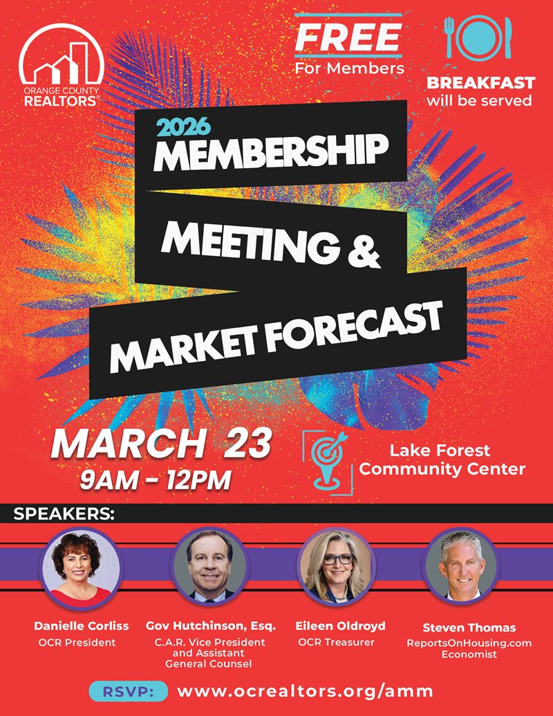 Join us for our annual Membership Meeting & Market Forecast featuring updates from the C.A.R. Vice President & Assistant General Counsel, Gov Hutchinson, and an Orange County Market Forecast from Steven Thomas with ReportsOnHousing.com. Plus, hear the State of the Association from OC REALTORS® President Danielle Corliss and Treasurer Eileen Oldroyd.