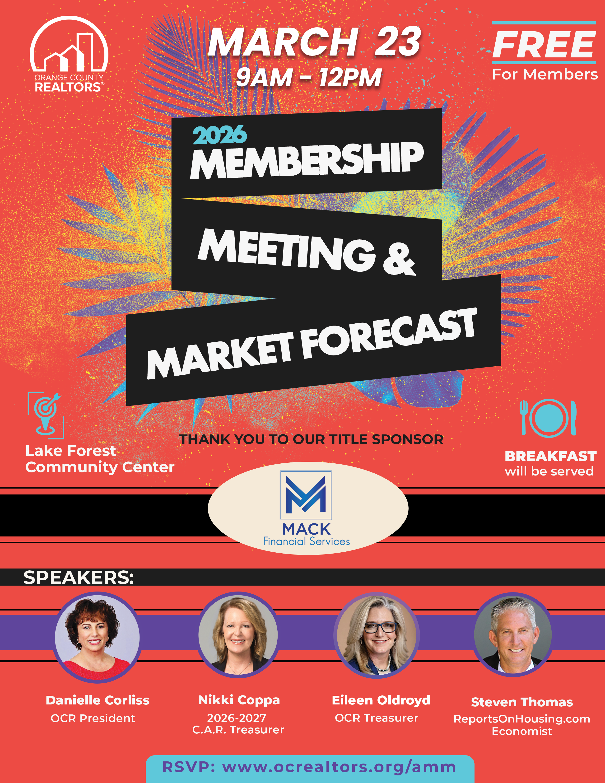 Join us for our annual Membership Meeting & Market Forecast featuring updates from the C.A.R. Treasurer, Nikki Coppa, and an Orange County Market Forecast from Steven Thomas with ReportsOnHousing.com. Plus, hear the State of the Association from OC REALTORS® President Danielle Corliss and Treasurer Eileen Oldroyd.